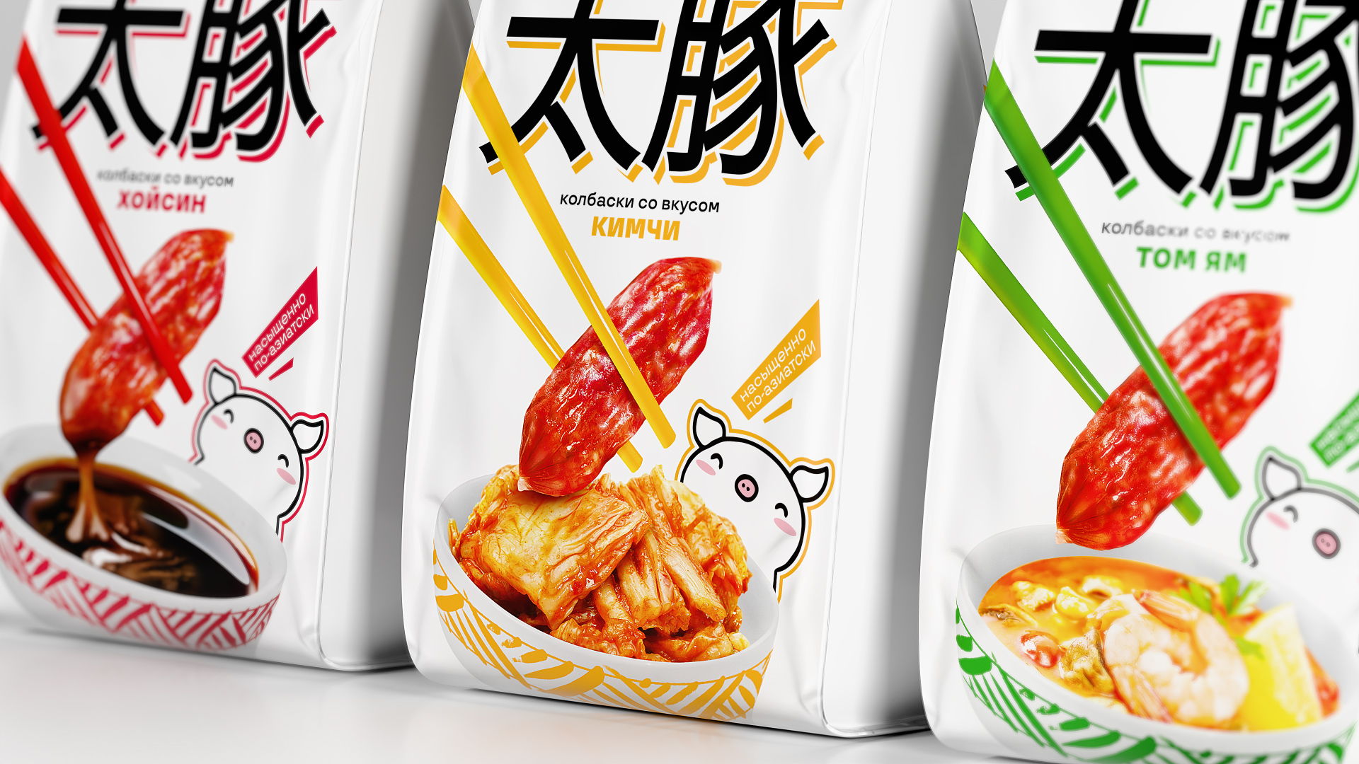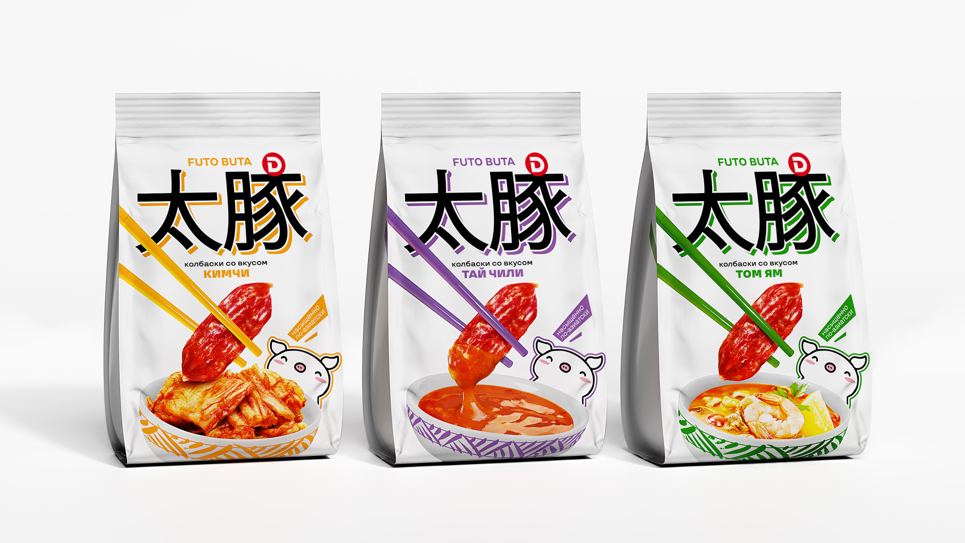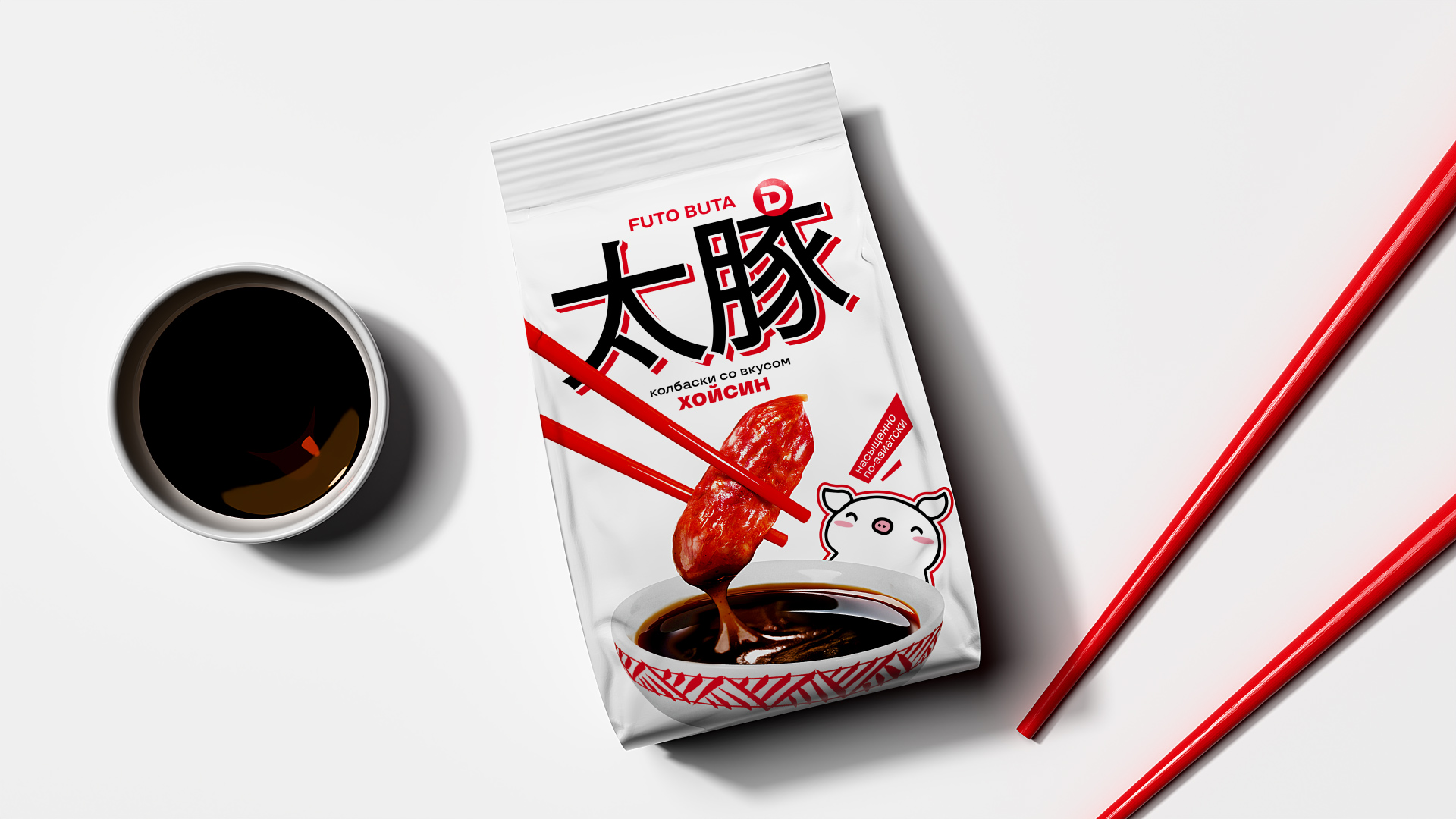 Колбаски Futo Buta ориентированы на молодую аудиторию, увлеченную азиатской культурой. Поэтому упаковка должна была не только отражать дерзкий характер продукта, но и заметно выделяться на полке среди конкурентов.