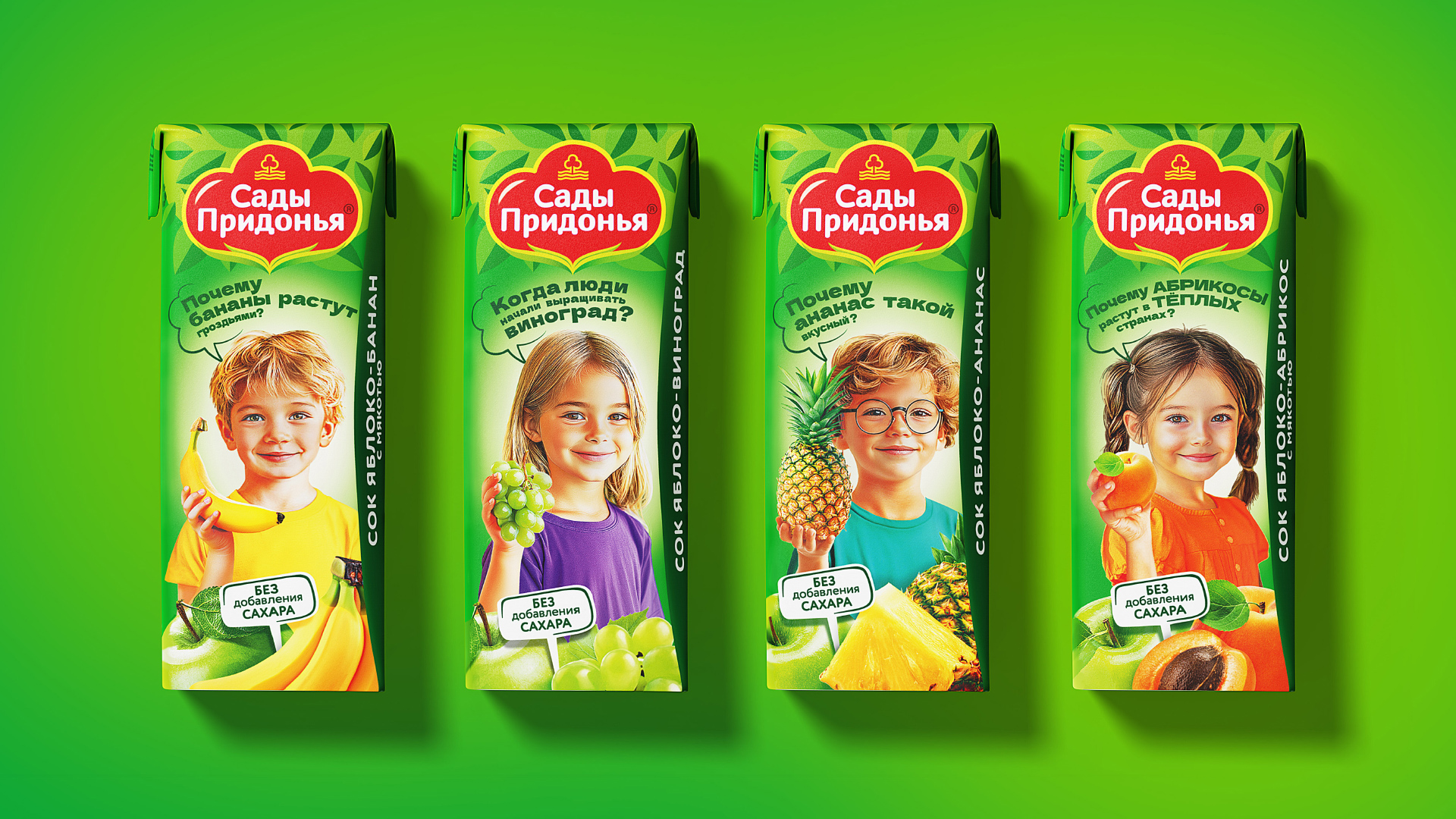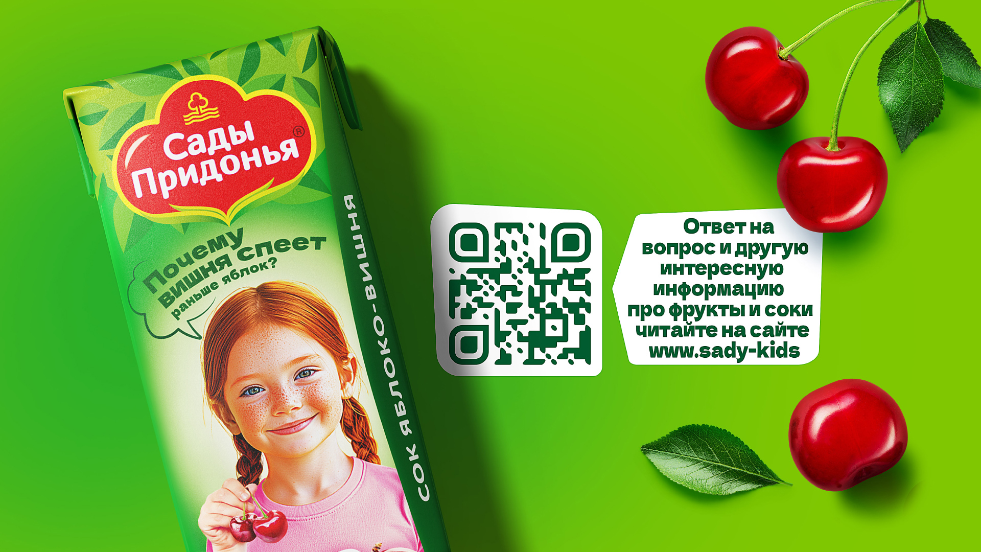 На упаковке появились интересные вопросы о фруктах и овощах («Почему яблочный сок такой ароматный?») и QR-код, ведущий на страницу с ответами.
