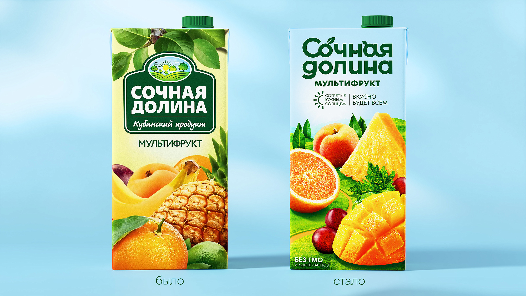 Логотип «Сочной Долины» также изменился: зеленая плашка с пейзажем уступила место легкому современному знаку. Начертание стало чище и крупнее, а сам логотип теперь органично живет поверх иллюстрации, а не отдельно от нее.