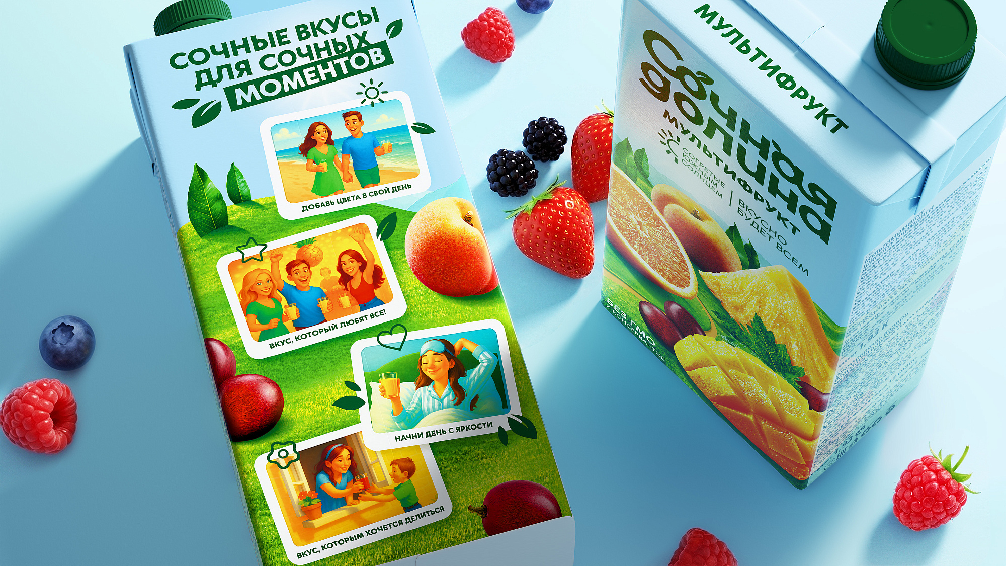 Слоган «Сочные вкусы для сочных моментов» на обратной стороне упаковки мы поддержали серией иллюстраций – сюжетами из жизни, в которых люди проводят время с удовольствием, а сок делает каждый момент ярким и запоминающимся.